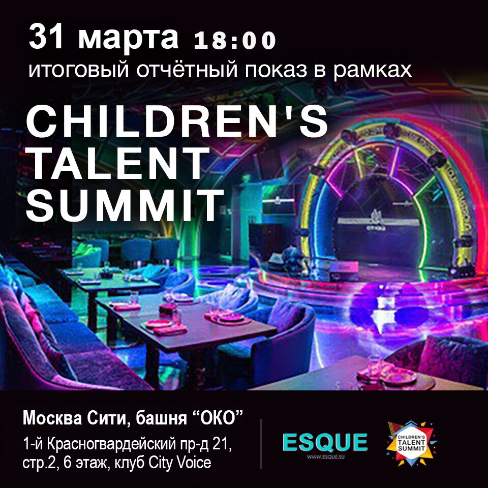 29 - 31 марта 2019 года в Ресторане City Voice города Москвы, совместно с журналом ESQUE состоится Children`s Talent Summit - это образовательно-развлекательный проект для детей, мечтающих стать известными артистами или моделями.